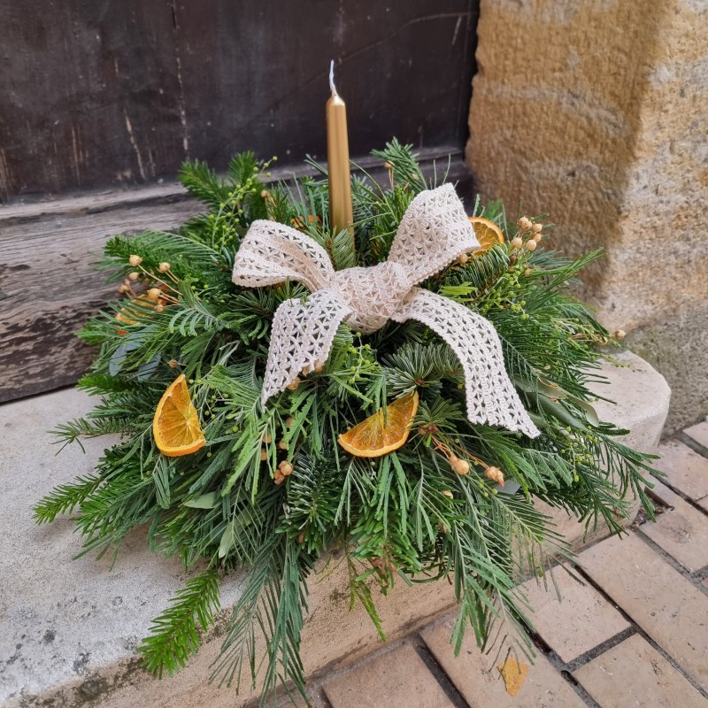 Venez vous plonger dans l'ambiance des fêtes en créant votre propre centre de table de Noël. En base de sapin produit en Dordogne, venez sublimer votre création avec des décorations, bougies et/ou fleurs fraîches produites en France et de saison.